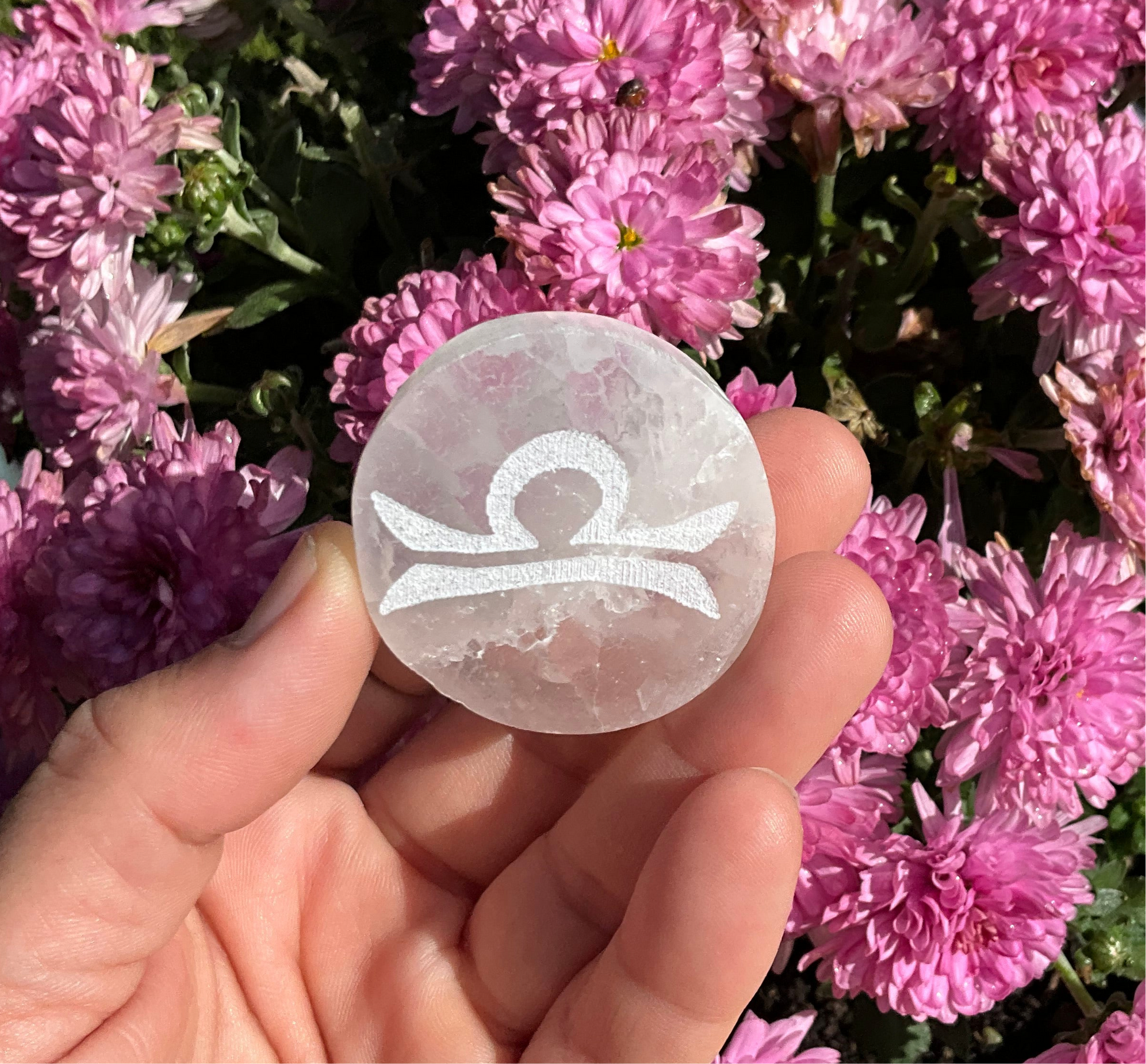 1 - Selenite Libra Disk - Etched with the Libra symbol, perfect for cleansing and changing your crystals.