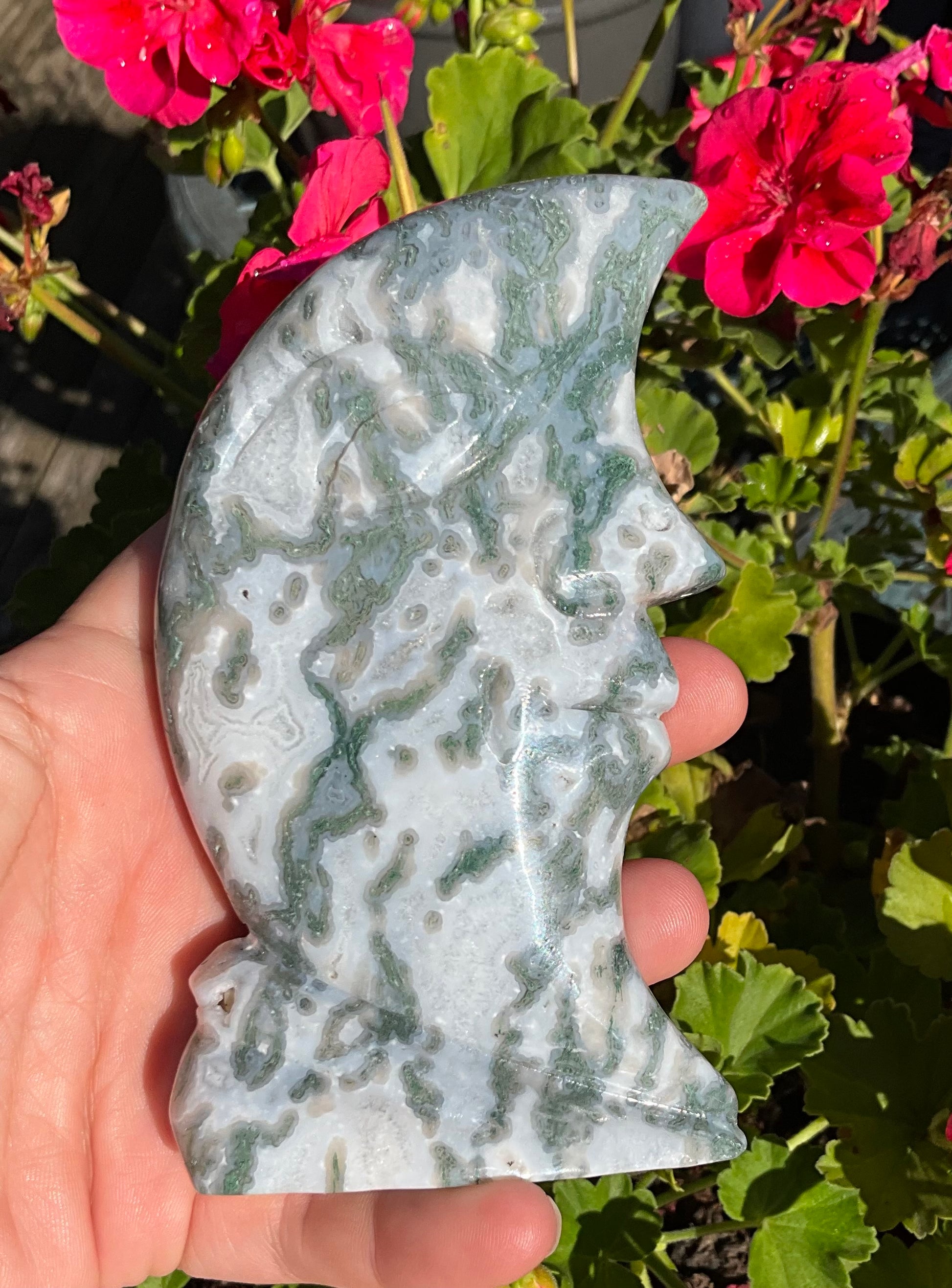 This enchanting Moss Agate Moon Carving, features a beautifully detailed face with displays of moon like, druzy, sparkling white colors and earthy greens branching throughout the stone. The moons’s serene face makes this carving feel both mystical and grounding.