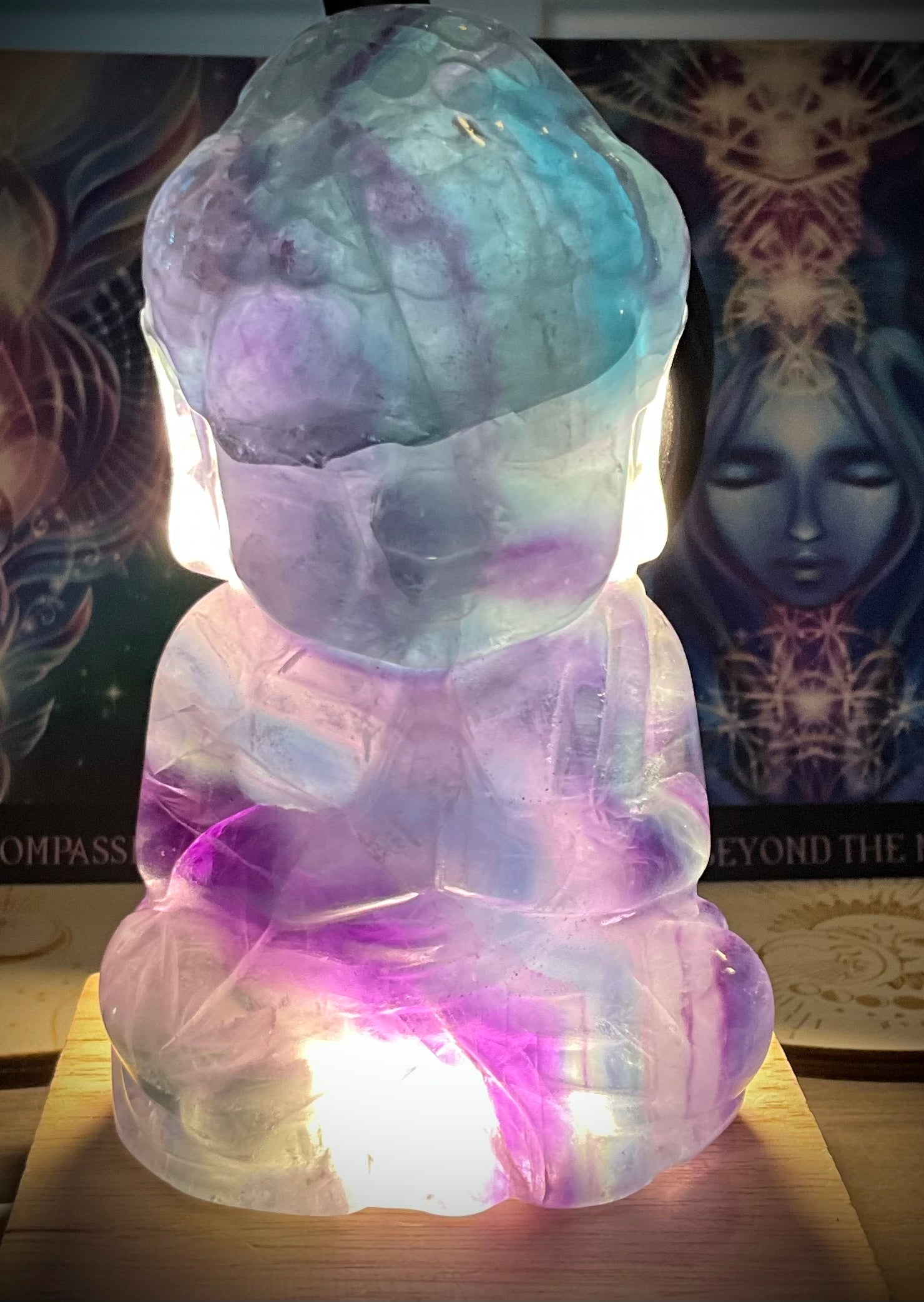 Invite calm, focus, and spiritual clarity into your space with this breathtaking Rainbow Fluorite Buddha carving. Carved in the likeness of a seated Buddha, this substantial piece beautifully showcases the natural bands of purple, green, aqua, and clear fluorite. When placed in the light, the carving comes alive with glowing bands and luminous inner flashes—making it an eye-catching and energetically uplifting addition to any sacred space.