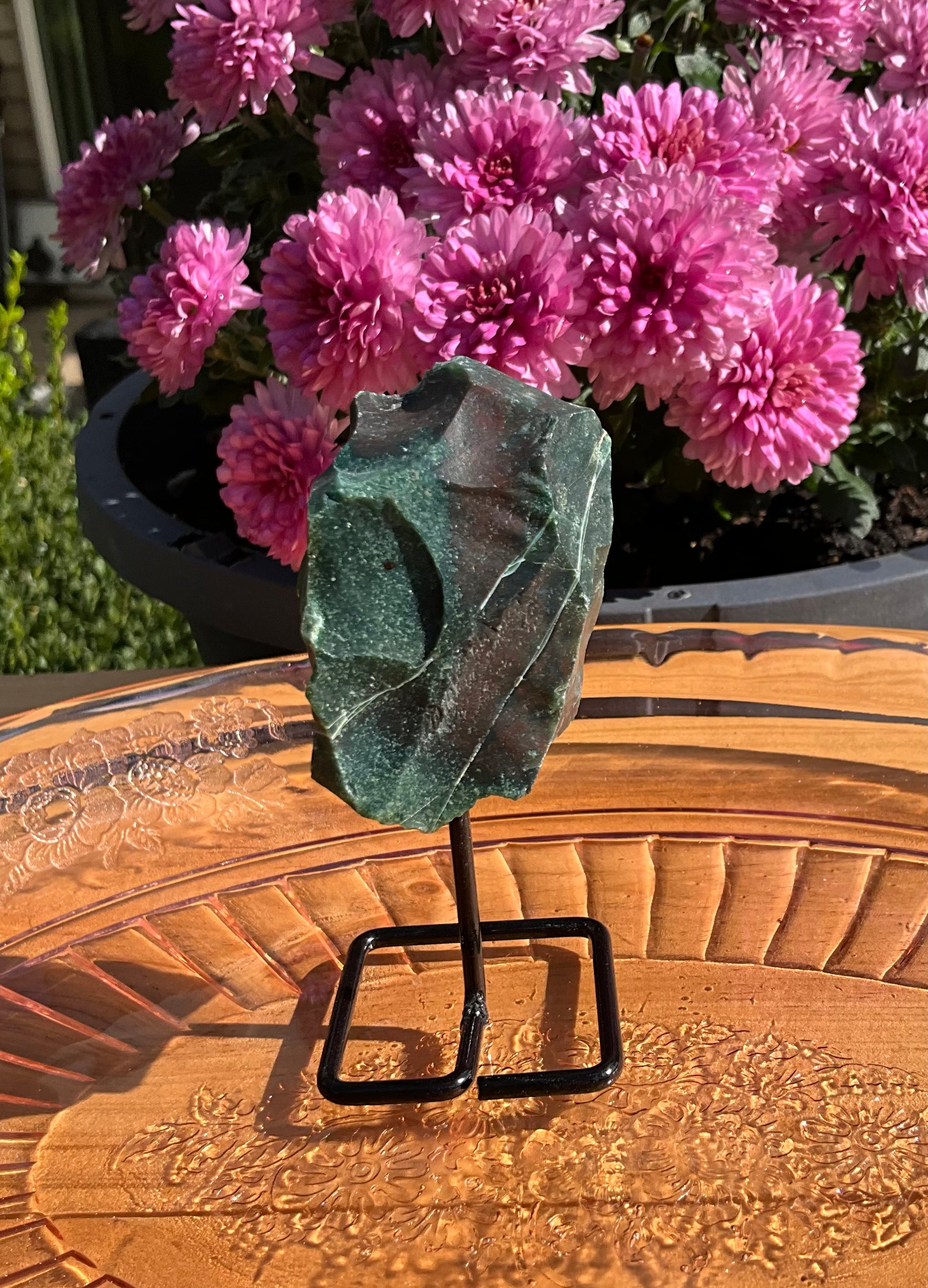 This striking Raw Bloodstone Specimen captures the earthy power and timeless beauty of one of history’s most revered healing stones. Displayed on a sturdy stand, this stone showcases natural surfaces with deep green hues streaked with rich red inclusions that give it its name. It is raw and unpolished highlighting the stones natural character and authentic grounding presence.