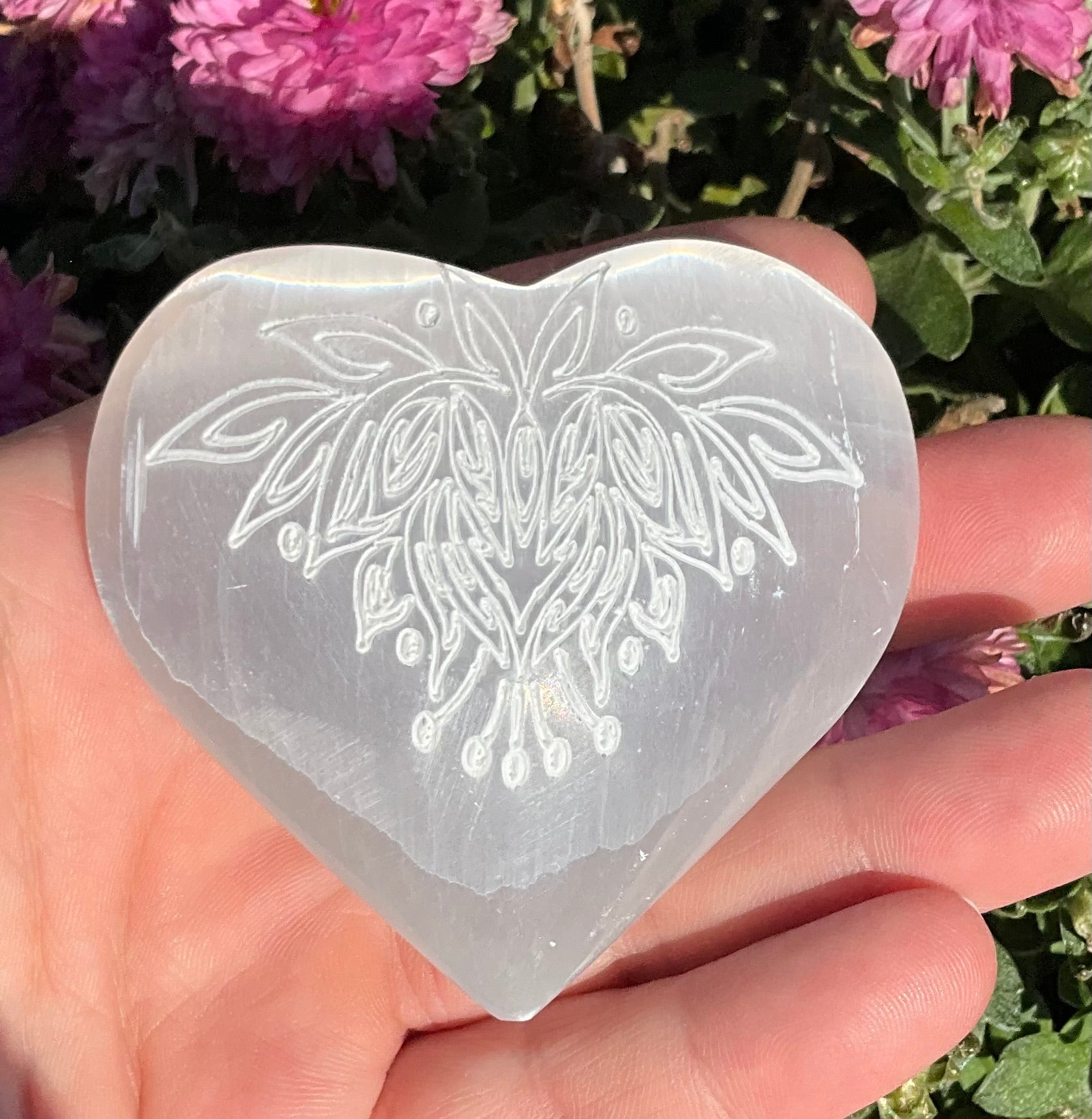 Delicately carved from luminous Satin Spar Selenite, this heart-shaped crystal is etched with the sacred lotus flower, a timeless symbol of purity, rebirth, and inner peace. The soft sheen of selenite catches light beautifully, while the lotus engraving adds a layer of intentional energy, making this heart a radiant addition to any collection. This Selenite Heart is ideal for gift giving, spiritual work, and inviting calming frequencies into your space. Selenite’s natural striations reflect its high vibration and helps cleanse your energy field while promoting serenity and clarity.